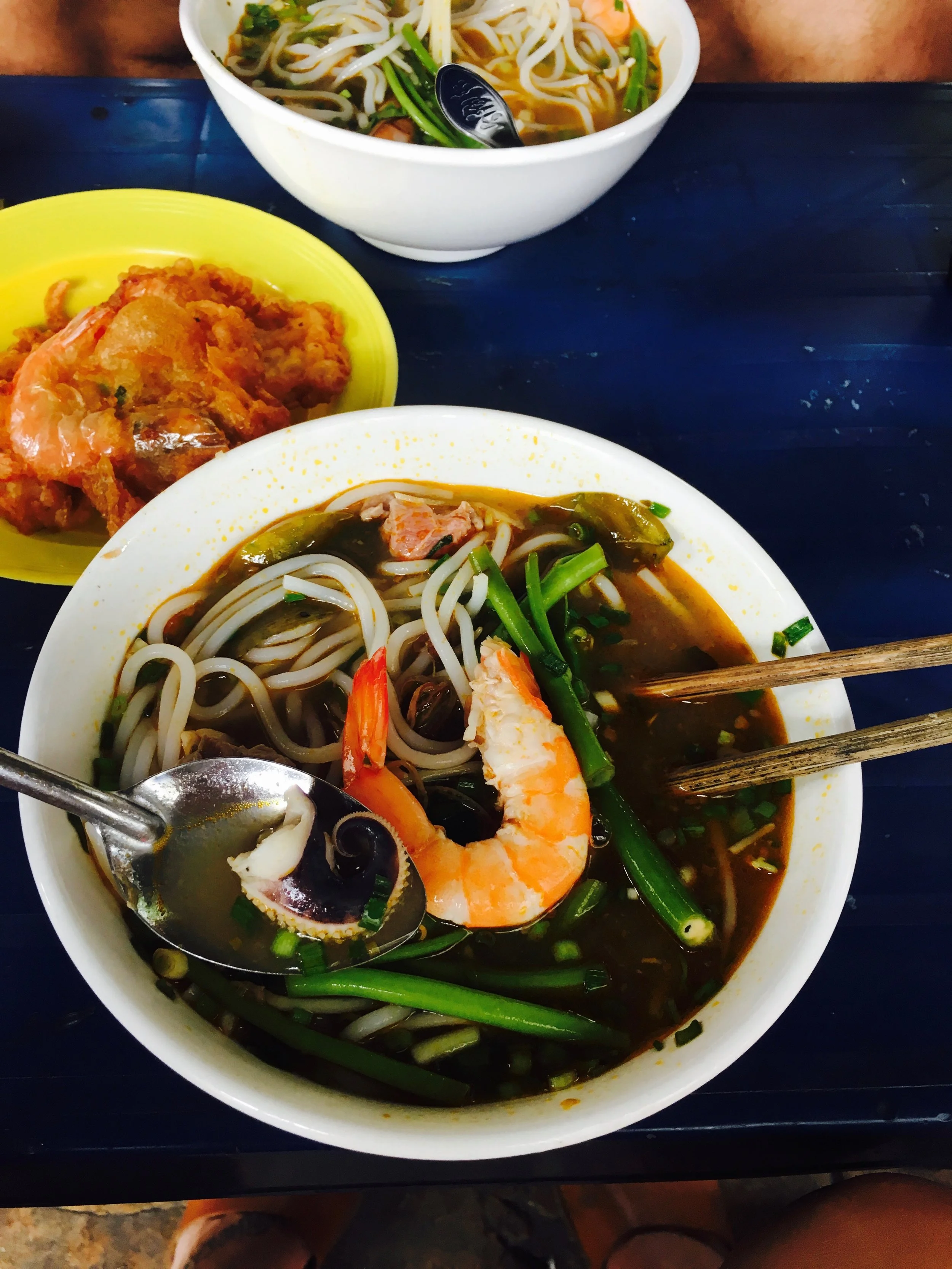 Lunch at the District 1 Lunch Lady made famous by visits from chef Anthony Bourdain. She puts on a pot of soup every day of the weeks and serves till its gone. We were there on a Monday , getting a take on a seafood pho. She's been so successful after her fame on TV its said she sent her kid to the US for University.